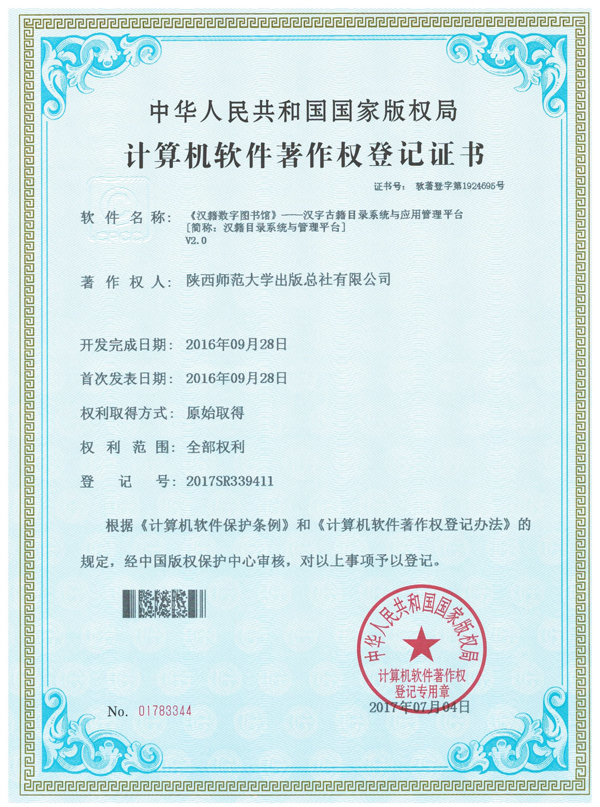 这是自2016年9月“汉籍”2.0版全新上线、《敦煌文献库》1.0版改版以来,“汉籍”专题分库开发的又一重要进展。早在今年4月,“汉籍”2.0版就通过了中国社会科学院知识产权中心有关知识产权的评估;7月,通过中国版权保护中心审核,获得了国家版权局颁发的“计算机软件著作权登记证书”(证书号:软著登字第1924695号)。