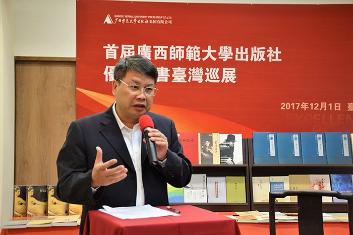 在当天的开幕式上,集团公司党委书记、董事长张艺兵介绍了本次图书巡展的有关情况。他表示,随着两岸交往的日益增多,台湾民众也逐渐能够接受简体字版图书,许多书店还会专门对简体字版图书进行销售。他说,本次广西师范大学出版社优秀图书巡展,希望能够把优秀的简体字版图书介绍给台湾的读者及出版同行,同时增进和台湾图书出版市场的交流,他表示,“台湾的出版市场化程度高,出版的各个环节高度职业化,有很多值得借鉴之处。”