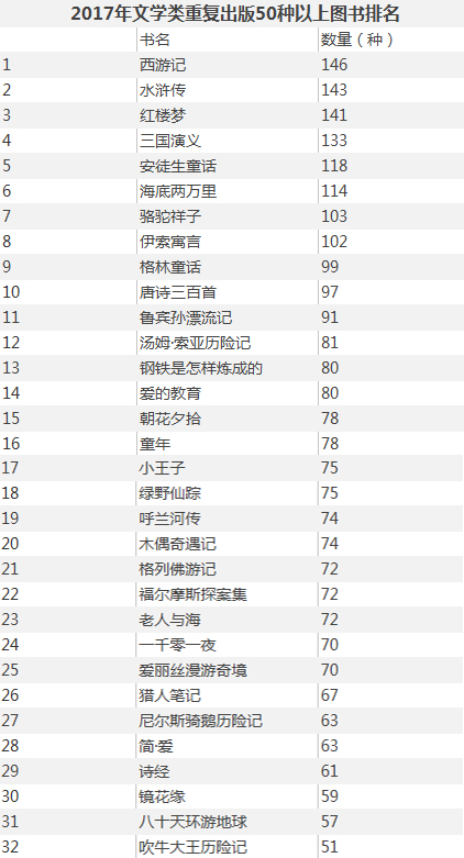 表3 2017年文学类重复出版50种以上图书排名