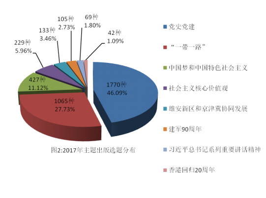 2017年主题出版选题主要聚焦八个方面:习近平总书记系列重要讲话精神、党史党建、社会主义核心价值观、中国梦和中国特色社会主义、 “一带一路”、雄安新区和京津冀协同发展、建军90周年、香港回归20周年(选题分布见图2)。其中,党史党建类和“一带一路”选题合计占比超过七成。