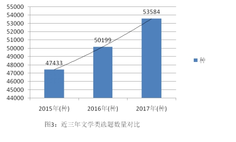文学类选题上涨幅度放缓。CIP统计数据显示,近三年文学类选题数量分别为47433种、50199种、53584种。其中,2017年文学类选题增长率为6.74%,与2016年(增长率为11.55%)相比,涨幅下降4.81%,涨幅放缓(见图3)。