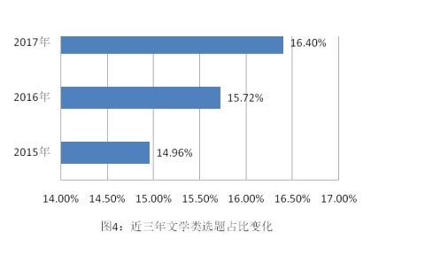 文学类选题占比逐年增加。文学类选题数量仅次于选题数量排名第一的文化、科学、教育、体育类(G类),近三年文学类选题占比分别为14.96%、15.72%、16.40%,占比逐年增大(见图4)。