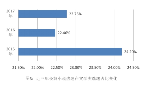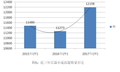 长篇小说选题小幅下降后上涨。长篇小说近三年的选题数量分别为11480种、11273种、12198种,其中,2016年出现1.80%的负增长;2017年增长率上升为8.21%,超过同期文学类选题涨幅(见图5)。
