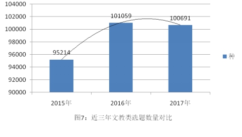 文教类选题经过上涨后数量略有减少。CIP统计数据显示,文教类选题数量分别为95214种,101059种,100691种。其中,2016年涨幅为6.14%, 2017年为0.36%的负增长。近三年文教类选题数量呈现先增后降的曲线分布,与2016年相比,2017年选题数量略有减少(见图7)。