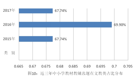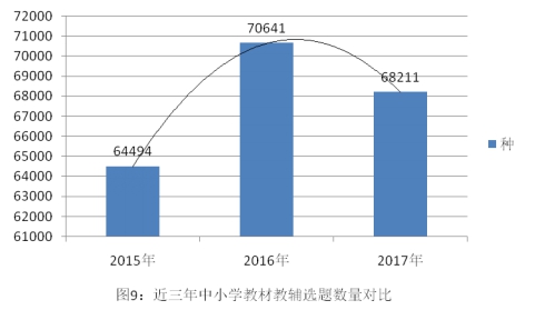 中小学教材教辅选题先涨后降。CIP统计数据显示,中小学教材教辅选题数量分别为64494种、70641种、68211种。其中,2016年涨幅为9.53%, 2017年为3.44%的负增长。近三年中小学教材教辅选题数量呈现先增后降的曲线分布,与2016年相比,2017年选题数量减少2430种(见图9)。