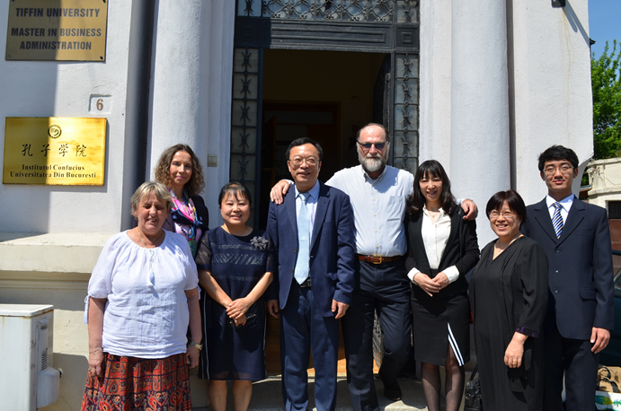 作家劳马(左四)、中国人民大学出版社副总编徐莉(左六) 及陪同人员与孔院中外方院长董京波(左三)、白罗米(左二)合影