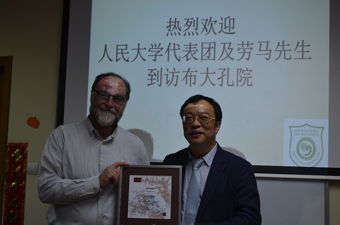 在颁奖仪式上,中国人民大学出版社副总编辑徐莉首先介绍了劳马作品中文版的出版过程,介绍了劳马作品在中国以及在世界各国的影响。罗马尼亚作家协会翻译处处长皮特代表罗马尼亚作家协会,向劳马颁发了荣誉证书,授予其“杰出散文奖”,并赞赏了劳马诙谐睿智的文字以及优秀杰出的文笔。