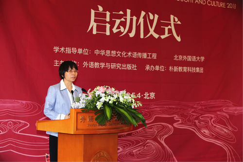 仪式上,术语工程秘书处负责人、外研社副总编辑章思英首先致欢迎辞。她谈到,“中华思想文化术语传播工程”是教育部委托给北外和外研社负责具体执行的国家重大项目,目前已经出版了6辑《中华思想文化术语》系列图书,版权输出超过13个语种。工程不仅在中国文化走出去方面硕果累累,在面向国内青少年的中国传统文化教育领域也取得了不俗的成果,术语大赛就是推动中华思想文化术语进入校园的一个重要通道。在致辞中,她同时表达了对大赛的良好祝愿,预祝大赛圆满成功。
