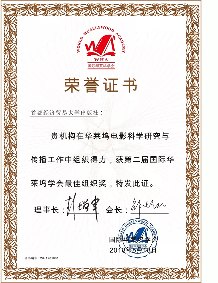 首都经济贸易大学出版社因在华莱坞电影科学研究与传播工作中组织得力,荣获第二届国际华莱坞学会最佳组织奖。在致辞中,邵陪仁教授对首都经济贸易大学出版社的专业精神和出版能力给予高度评价和赞许,并高兴地表示首都经济贸易大学出版社将成为展现华莱坞研究学术成果的主阵地。《华莱坞电影研究丛书》及华莱坞国际译丛不久将陆续推出,欢迎中外学者携手共谋华莱坞之繁荣,共筑中华文化之辉煌。