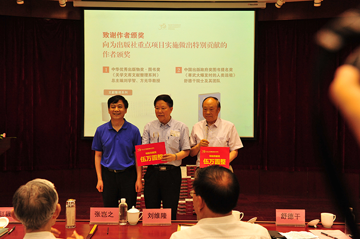 西北大学党委书记王亚杰为《关学文库》主编刘学智教授、方光华教授以及《寒武大爆发时的人类远祖》作者舒德干院士及其团队颁发“特别贡献奖”,分别奖励伍万元。