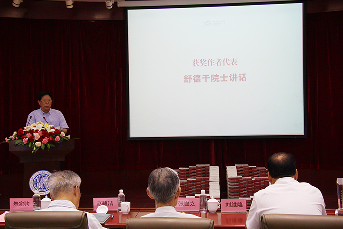 舒德干院士代表获奖团队介绍《寒武大爆发时的人类远祖》一书。桂维民代表业务合作单位讲话。朱家驹指出,西北大学出版社在不断地内部改革中逐步完善自身的运行体制和经营管理制度,形成了依托高校、立足陕西、面向全国,多层次出书,多渠道营销,多角度参与出版市场竞争的办社格局;深耕专业出版,做精大众出版,做好教育出版,产生了一批具有里程碑意义的标志性成果,树立了企业形象,形成了品牌特色,构建起高效运转、灵活自如的运行机制,在我国高等教育出版界特别是陕西出版界,占有了极为重要的位置。近年来西北大学出版社在学术出版上做出了成绩,《关学文库》出版后引发了包括中国共产党新闻网、国务院网站在内的300余家主流媒体的报道和介绍,为西北大学、为陕西省出版行业赢得了很高的声誉。