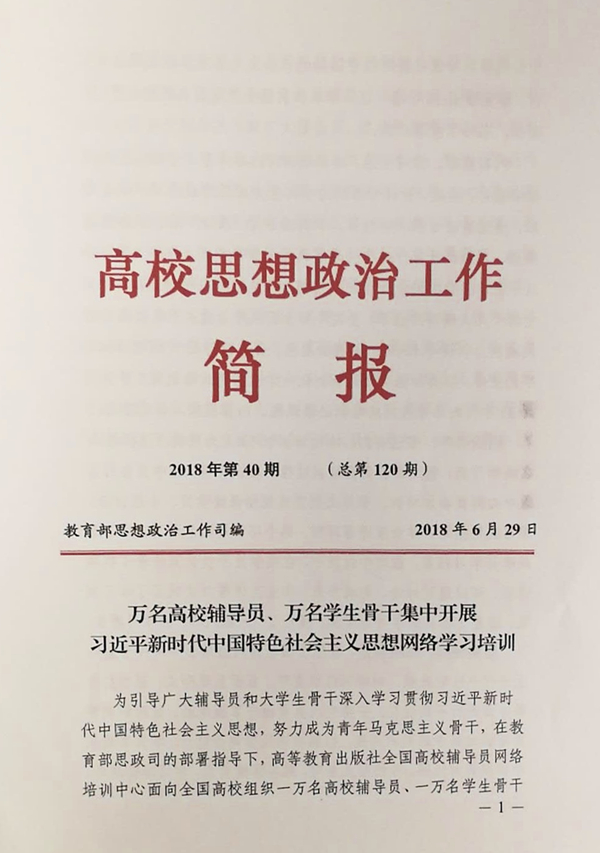 日前,由高教社大学生在线“高校辅导员网络培训中心”举办的万名高校辅导员、万名大学生骨干学习习近平新时代中国特色社会主义思想示范性网络培训工作受到好评,教育部高校思想政治工作简报〔2018〕第40期刊发专题报道,认为该项工作“取得了显著成效”。