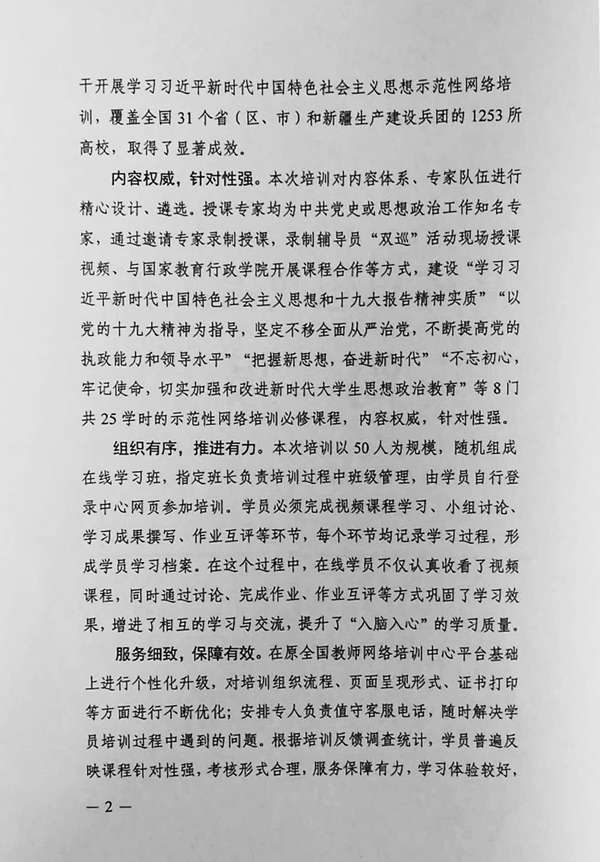 本次培训对内容体系、专家队伍进行精心设计、遴选,授课教师均为中共党史或思想政治工作领域的知名专家,内容权威,针对性强。同时,培训得到了高教社高校教师网络培训中心的大力支持,对培训平台进行了个性化升级改造。在多方的共同努力下,本次培训内容权威及时,组织保障有序有力,得到了学员们的一致肯定。