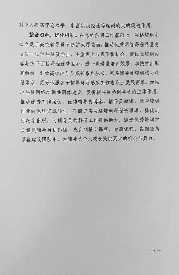 下一步,高校辅导员网络培训中心将立足于扩大高校辅导员培训覆盖面,推动优质网络课程尽量惠及每一位辅导员及学生;加快推出配套教材,完善辅导员培训核心课程体系,更好地服务于辅导员及思政工作者职业发展需求;加强辅导员网络培训共同体建设,发挥辅导员参训学员的主体作用,为辅导员个人成长提供更大的机会与舞台。