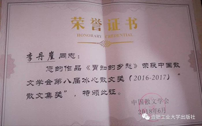近日,第八届冰心散文奖在四川省眉山市揭晓。由合肥工业大学出版社出版、安徽省青年作家李丹崖凭借散文集《胃知的乡愁》荣获冰心散文奖“散文奖”。