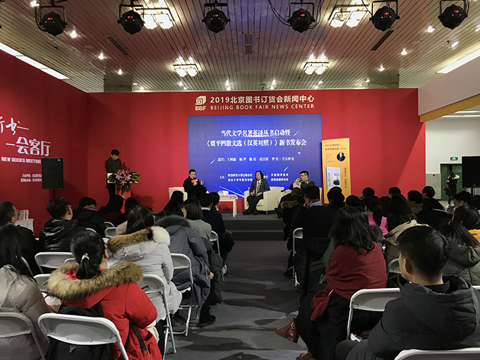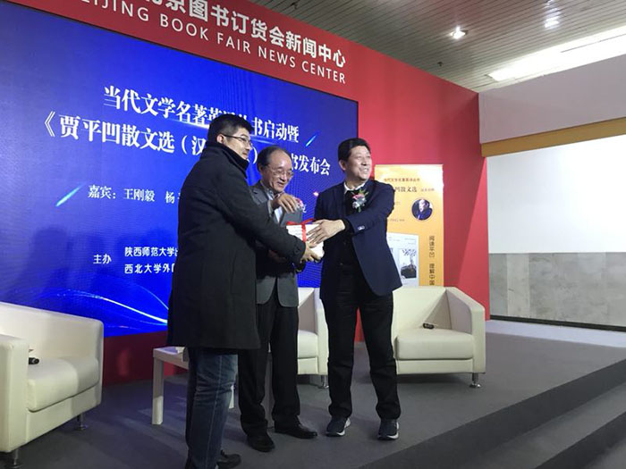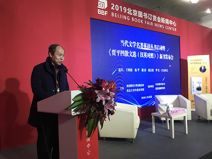 本网讯 1月10日,2019年北京图书订货会开幕当天,由中国翻译协会、陕西省翻译协会支持,陕西师范大学出版总社、西北大学外国语学院主办的“当代文学名著英译丛书启动暨《贾平凹散文选(汉英对照)》新书发布会”在1号馆一楼大会新闻中心隆重举行。中国翻译协会常务副会长兼秘书长、中国翻译研究院执行院长王刚毅,当代中国与世界研究院副主任、中国翻译协会副秘书长杨平,陕西省翻译协会会长、西北大学外语学院教授、院长、博士生导师胡宗锋,《美文》杂志副主编、西北大学教授穆涛,西北大学外国语学院院长助理、副教授罗宾•吉尔班克和陕西师范大学出版总社董事长兼社长刘东风、副社长屈瑞新出席活动。《光明日报》、《中国新闻出版广电报》、《中国出版商报》、《中华读书报》、人民网、中新网等媒体的记者参加活动。