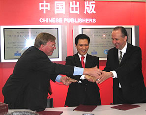说这句话的李朋义刚刚参加完了今年的法兰克福书展。法兰克福书展于1949年由德国书业协会创办,堪称是全世界规模最大的书展,其对于世界图书出版文化事业具有极大的影响力,被称作出版业的“奥运会”,是全球出版业展示实力、发展合作,实现贸易的重要场所。正是在这次法兰克福书展上,李朋义和他带领的外研社团队“出尽风头”——书展开幕第二天,著名的英国《Bookseller》(《书商》)杂志的头版头条就刊登了题为《China on worldstage》的报道,并配发了李朋义的大幅照片。报道的主要内容是外研社与培生教育集团、麦克米伦教育集团的“‘对外汉语出版工程’海外合资公司备忘录签字仪式”。