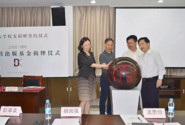 2017年6月15日下午,上海大学举行校友捐赠签约暨“上大社·锦珂优秀图书出版基金”揭牌仪式。上海大学党委副书记、副校长龚思怡,上海市出版协会理事长胡国强,上海锦珂塑胶科技有限公司董事长陈明华,上海大学对外联络处处长、上海大学教育发展基金会秘书长许瑞,上海大学出版社董事长、社长戴骏豪,优秀作者代表、社会学院教授顾骏,以及各学院各部处的主要领导等出席活动。
