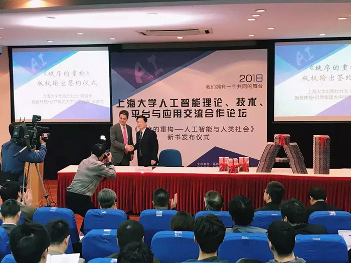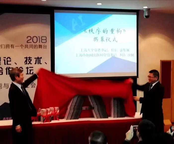 2018年3月28日,上海大学党委书记校长、中国工程院院士金东寒与上海市新闻出版局徐炯局长共同为《秩序的重构——人工智能与人类社会》新书揭幕。