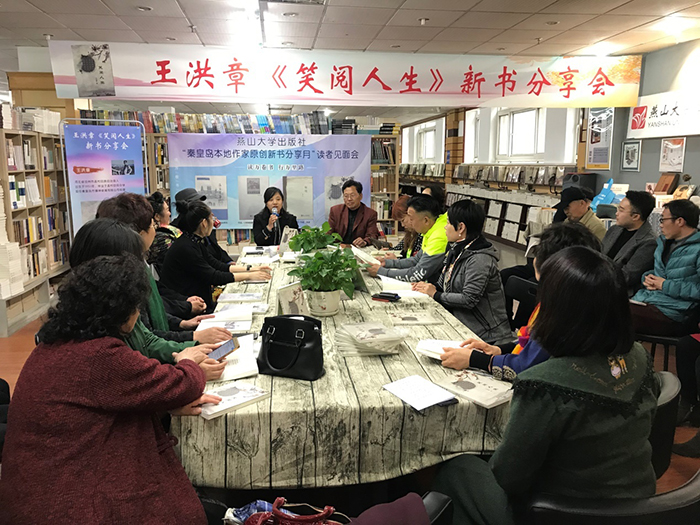 第四场,2019年4月20日,燕山大学出版社出版的新书《笑阅人生》分享会在秦皇岛市五兴图书广场举行。本书作者王洪章出席分享会,活动由五兴图书广场总经理高丽莉女士主持,本书作者王洪章讲述了创作初衷,将自己的创业经验以诗的形式表达给了读者,读者受益匪浅。在听完作者讲述创业之路后都受到了很大触动,大家有种相见恨晚的感觉。