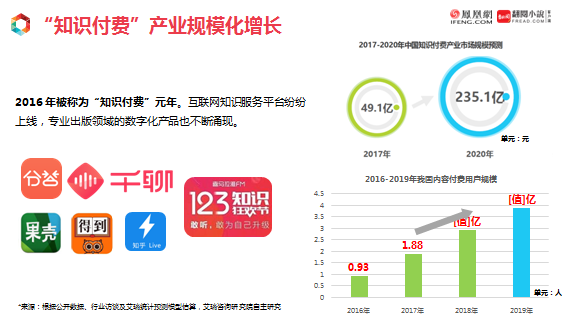 2017年,知识付费行业的规模已达49.1亿元,预计到2020年,将达到235.1亿元,可能会增长五倍。而用户规模,2016年只有0.93亿人,2019年将有3.87亿人。不管从哪个指标来看,知识付费行业都呈现出快速增长的状况。