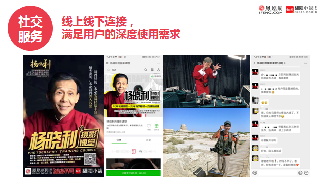 社交服务方面,用户获取知识付费内容不是一个被动的接受知识的过程,而是可以和讲师主动连接的过程。所以凤凰互娱尝试线上线下连接,打造用户的深度使用需求。如与杨晓利开展的摄影课堂,这一知识付费产品的策划有一个大前提,杨晓利一直致力于古塔的拍摄,他希望用图片将古塔保留下来,30多年间,他拍摄了3000多座古塔,如今他已经70多岁了,没有精力到深山老林里继续拍摄。他希望通过摄影课程唤起年轻人对于古塔文化的兴趣,推动更多人为这一建筑艺术贡献力量。“杨晓利摄影课堂”在小鹅通同步上线,主要内容包括如何购买摄影器材、如何选景等,在课程的基础上,还建立了一个微信群,帮助用户进一步与讲师进行交流,还会招募用户,与参与实地采风活动。这种线上线下的连接,使得用户能够学以致用。