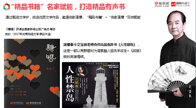 以文字为核心的听书,是什么意思呢?凤凰互娱是一个以文学IP为核心公司。旗下有3000部全版权文学作品、3000余位签约作家。文学IP是核心竞争力。这些文学IP怎样能衍生出除了在线阅读之外的价值?凤凰互娱尝试有声书、漫画,以及一些演绎和全IP开发。