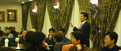 当晚,北京外国语大学副校长兼外研社社长李朋义、外研社常务副社长于春迟、副总编辑章思英等社领导以及汉语事业部的全体同仁一起热情地迎接作者,共叙旧谊,共话未来。晚会由于春迟常务副社长主持,李朋义社长致辞。李社长首先衷心感谢所有的专家、学者们在过去一年里为外研社汉语出版事业发展所做出的贡献,正因为有这样一批优秀的专家学者的支持,才使外研社汉语部在几年的发展中逐渐地成熟壮大起来。随后,李社长向来宾们介绍了近年来外研社汉语出版取得的成绩以及对未来发展的战略构想和“十一五”规划,表示了发展对外汉语的愿望和决心。李社长讲到,在我国努力推进汉语走向世界的大背景下,作为外研社,有责任也有义务参与到我国对外汉语战略中来,利用得天独厚的国外合作优势为推动汉语文化贡献出自己的一份力量。李社长充满激情的致辞赢得了大家热烈的掌声。