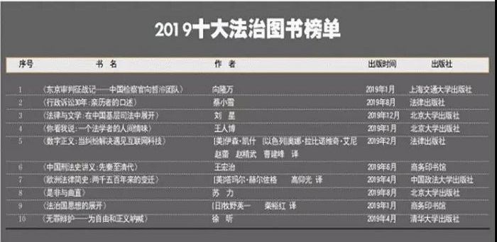 据介绍,一年一度的《法治周末》十大法治图书评选活动是联合读者、书评人、学者共同参与的一项评选。本次评选结合本年度出现在《法治周末》书评版上的法治图书,整理出中国内地出版的法治图书近百本;先经过《法治周末》编辑部和评委团的联合评议,推出优秀法治图书60种参与今年十大法治图书的评选;之后,经过评委的首轮投票产生30本优秀法治图书;最后,再由读者投票评选出最终的十大法治图书。