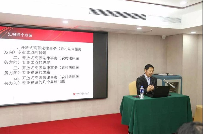 委员会副主任委员、湖南广播电视大学(湖南网络工程职业学院)法学院院长刘建宏教授介绍了他对开放式高职法律事务(农村法律服务方向)专业建设的思考和资源建设计划,并邀请委员会成员参与该专业的课程资源建设工作。
