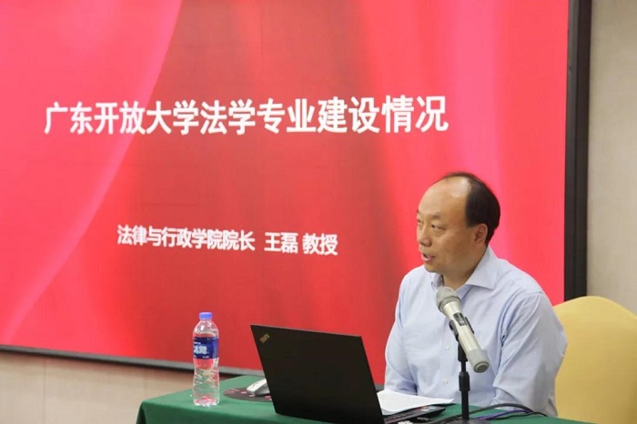 委员会委员、广东开放大学法律与行政学院(健康产业学院)院长王磊教授,介绍了学校和学院的基本情况以及法学专业课程建设的现状和思考。
