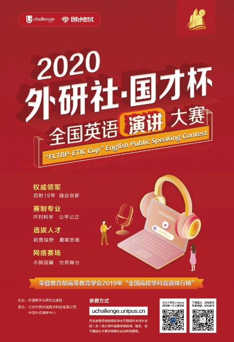 2020“外研社·国才杯”定题演讲赛题Challenge to All以年初突如其来的新冠肺炎疫情为大背景,引领学生思考:在当今世界我们面对着哪些挑战,应该采取何种行动,走哪种道路来应对挑战、构建更美好的未来?赛题倡导青年一代要聚焦当下、放眼未来,体现了大学生肩负时代重任的使命感,更弘扬了中国人“自强不息,厚德载物”的精神传承。