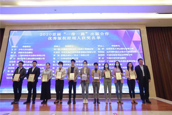 中国人民大学出版社国际出版中心主任刘叶华也获得“一带一路”出版合作优秀版权经理人的荣誉。李永强社长为获奖优秀版权经理人颁奖。