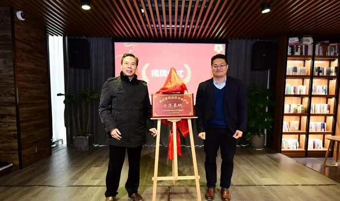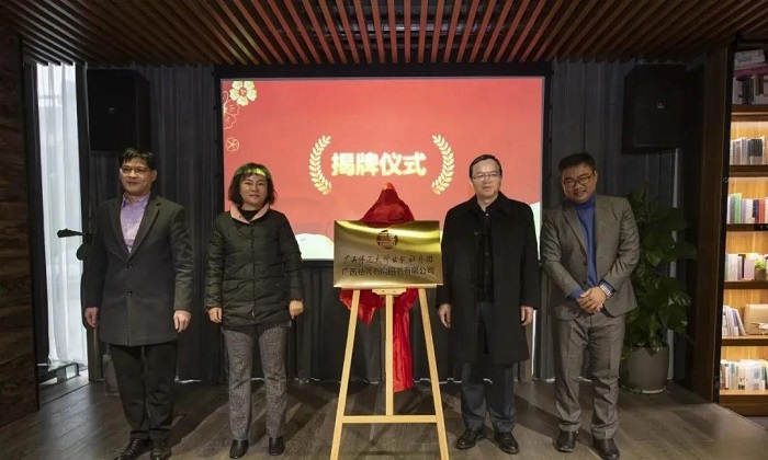 陈贵根(左一)、蓝廖国(右一)为独秀书房的“自治区文化产业示范基地”揭牌 摄影/李显杨