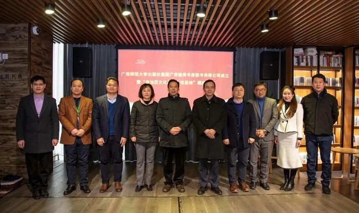 12月18日,广西师范大学出版社集团广西独秀书房图书有限公司(以下简称“独秀书房公司”)成立暨“自治区文化产业示范基地”揭牌仪式在独秀书房·旗舰店举办。桂林市文广旅局党组成员陈贵根,广西师范大学资产管理处处长刘玉兰,广西师范大学出版社集团(以下简称“广西师大社集团”)党委副书记、总编辑汤文辉,党委副书记、纪委书记蓝廖国,副总裁施东毅,副总裁、工会主席莫曲波,董事长助理、董事会秘书张俊显,独秀书房公司总经理容罡等领导嘉宾出席了本次活动。