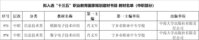 近日,教育部公布了“十三五”职业教育国家规划教材书目的名单。经单位申报、形式审查、网络和会议评审等程序,共有3973种教材拟入选。中南大学出版社共计21本教材获评。