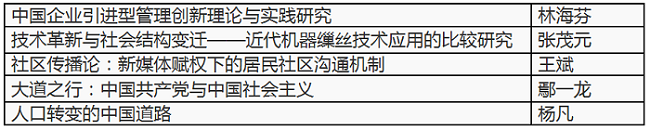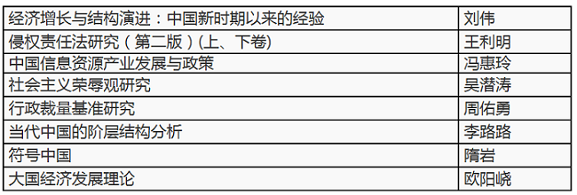 近日,教育部第八届高等学校科学研究优秀成果奖(人文社会科学)获奖成果名单正式公布,中国人民大学出版社有25种图书入选。其中,一等奖8种,二等奖9种, 三等奖3种,青年成果奖5种。《经济增长与结构演进:中国新时期以来的经验》《侵权责任法研究(第二版)(上、下卷)》《中国信息资源产业发展与政策》《社会主义荣辱观研究》《行政裁量基准研究》《当代中国的阶层结构分析》《符号中国》《大国经济发展理论》荣获一等奖。