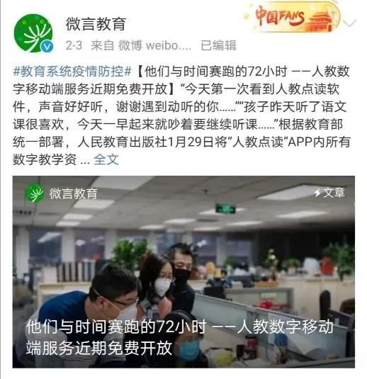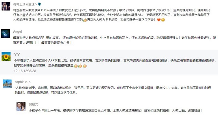 “人教点读”APP始终坚持发展初心,牢记社会责任。2020年初新冠肺炎疫情期间,在教育部的要求和指导下,在人教社、数字公司的安排和部署下,“人教点读”APP响应教育部“停课不停学”号召,面向全国中小学生免费开放平台内所有资源,其下载量一度跃居苹果商店免费应用榜榜首,产品运营与技术保障服务团队持续加大人员及成本投入,有效保障了全国32个省(市、自治区)上千万名中小学生的居家在线学习需求上1400多万名中小学生的居家在线学习需求,以实际行动赢得了各级教育主管部门及广大师生家长的广泛好评。