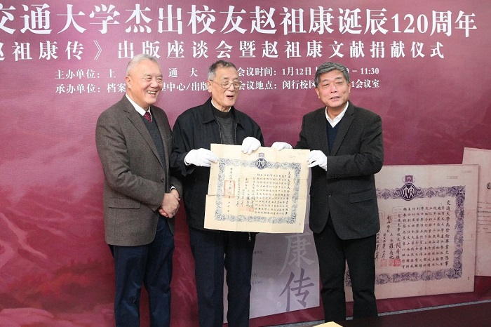赵国通、赵国屏向交大捐赠赵祖康交大毕业证,与张安胜校长合影