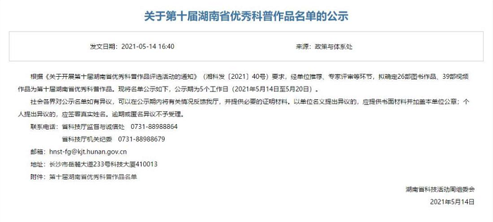 为深入学习贯彻习近平新时代中国特色社会主义思想,全面落实党的十九大精神,普及科学知识、弘扬科学精神,激励广大科技工作者和社会各界参与科普创作与出版的积极性,湖南省开展了第十届省优秀科普作品评比。