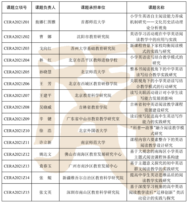 目前,中国英语阅读教育研究院2021年度一般课题正在火热招募中,中阅院诚挚欢迎广大英语教师和教研员加入课题研究队伍,共同推动中国英语阅读教育事业的发展与繁荣。
