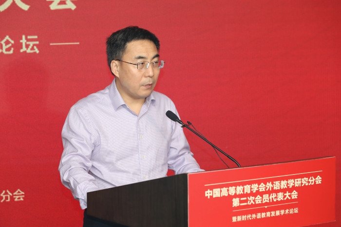 中国高等教育学会副秘书长郝清杰宣读《关于同意中国高等教育学会外语教学研究分会换届方案的批复》并讲话。郝秘书长对换届大会的召开表示祝贺,希望新一届理事会要提高政治站位,坚持围绕中心服务大局,认真贯彻实施学会发展战略构想,遵章守纪,服务需求,遵循分支机构建设规范,认真履行职责,聚焦主业,推动分会工作高质量发展。他从中国高等教育学会的使命与宗旨出发,对外语教学研究分会建设提出了四方面要求:加入分会需要“真热爱”,分会挂靠到哪一所大学是对这个大学在相关领域的“真认可”,把分会办好需要“真投入”,依托分会要为战线“真服务”。分会唯有通过提供“真服务”、抓住“真问题”,方能在服务当中不断发展壮大,为新形势下国家发展和我国外语教育改革创新作出更大贡献。