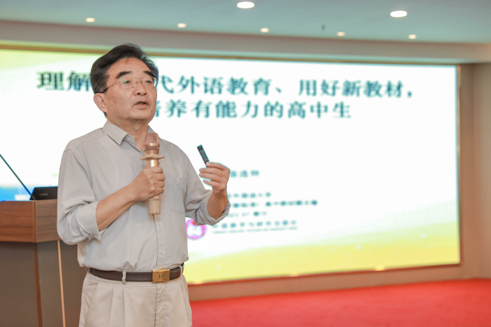 北京外国语大学教授、全国基础外语教育研究培训中心常务副理事长、外研社《英语》(新标准)高中教材副主编张连仲进行了题为“理解新时代外语教育、用好新教材,培养有能力的高中生”的主题讲座。首先,他结合当前的时代背景指出,外语教学要反映现实社会和世界变化,用鲜活有意义的外语资源教育学生,让学生学会用英语理解信息、表达思想,从而成为具有中国情怀、国际视野,为祖国服务的社会主义事业接班人。随后,他介绍了高中新教材的修订思路和编写特色、教材框架和内在逻辑,他指出,新教材体现课标理念,以丰富的话题、鲜活的语言、引导思维的设计,让学生更好地认知大千世界。他表示,面对新教材,需要老师们以积极心态适应新形势,调整角色定位和教学习惯,让教学实施更好地实现教材意图,通过活化各项活动,引导学生掌握单元内容,锻炼学习能力。最后,他从一线老师的实际困惑出发,分析了教材、教师和教学的关系,并结合具体的教学案例和丰富的教师资源及平台资源,为老师们提供了切实可行的教学建议。