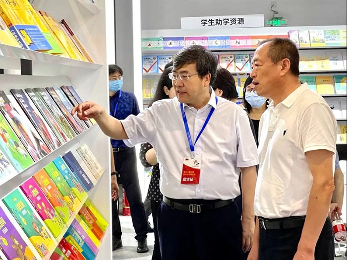 黄强还谈到,“培根铸魂、启智增慧”跟十九届五中全会提出的高质量发展完全一致。在“十四五”时期的发展,应以习近平总书记重要回信精神为根本遵循,以高质量发展为主线。黄强讲到:“从教材的研究、编写、编辑、设计、印刷、出版、发行每一个环节,都要发扬工匠精神,体现教育精神,体现爱国精神。对于学生来讲,重要的不仅是教材还有教育读物。比如说,由人教社编研出版并在书博会展出的《习近平新时代中国特色社会主义思想学生读本》以学生能理解的方式,图文并茂地表现出来,切实推动习近平新时代中国特色社会主义思想进课堂进学生头脑,增强学习的系统性和实效性。”