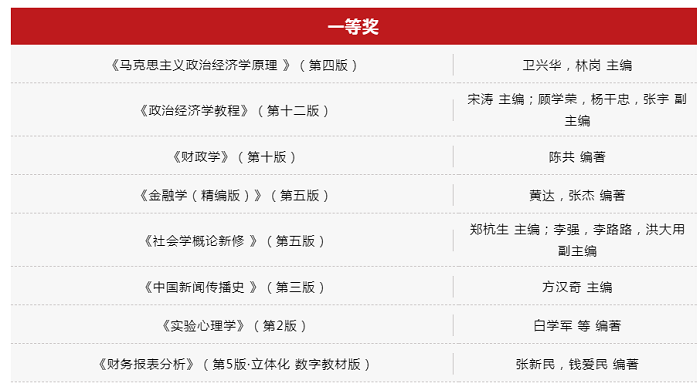 在人大社获奖教材中,高等教育类教材表现优异,在经济、工商管理、公共管理、新闻传播、社会学、心理学和统计学等学科,不仅获奖数量领先,而且有多种获评一等奖!