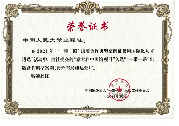 2021年10月15日下午,由中国出版协会、中国出版集团有限公司主办的第二届“一带一路”出版合作经验交流会在四川成都成功举办。来自全国出版发行界的近200名代表围绕“‘一带一路’出版合作新机遇新举措”进行了深入交流和探讨。会上,“一带一路”出版合作典型案例征集和国际化人才遴选活动结果名单同时公布。中国人民大学出版社“意大利中国馆项目”荣获“‘一带一路’出版合作典型案例(海外布局和运营)”奖;李永强社长获得“‘一带一路’国际化领军人才”荣誉称号。