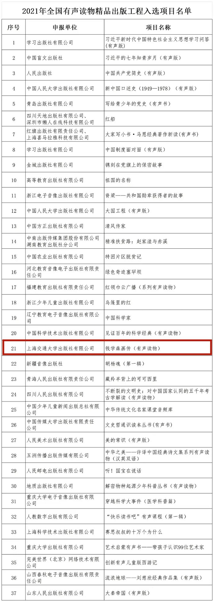 国家新闻出版署组织的“全国有声读物精品出版工程”迄今已有四届。10月24日,“2021年全国有声读物精品出版工程”入选名单公示,上海交通大学出版社《钱学森画传》有声读物成功入选。这是出版社继《查医生援鄂日记》(2020年全国有声读物精品出版工程)之后,第二次入选该项工程。