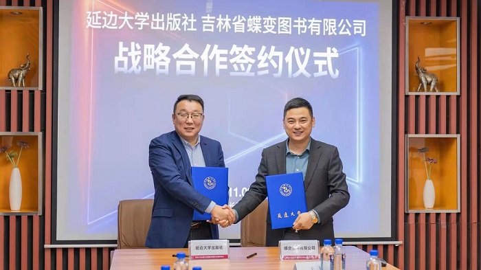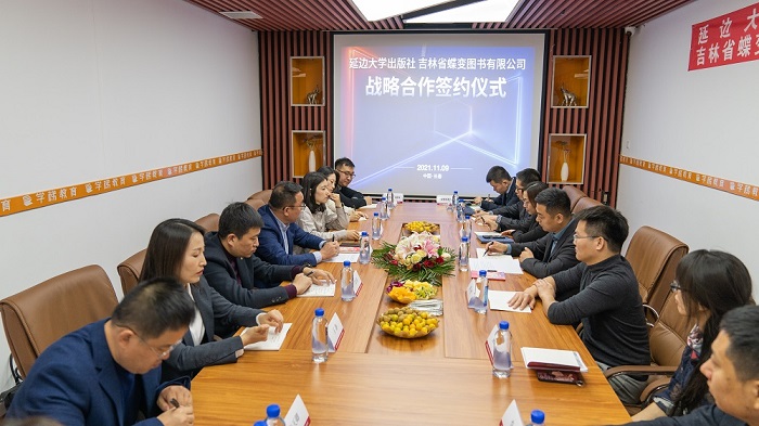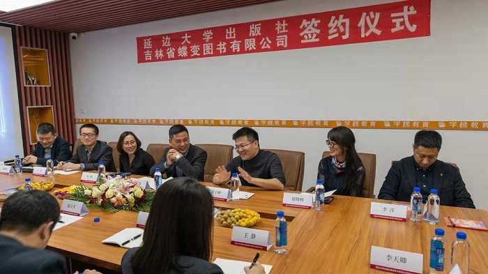 11月9日,延边大学出版社与吉林省蝶变图书有限公司举行战略合作项目签约仪式。延边大学出版社总经理赵立才、财务总监董花兰、总经理助理兰公亮、吉林省蝶变图书公司董事长陈炳旭、总经理董子乔出席签约仪式。延边大学出版社北京子公司、长春编校中心、长春图书营销部相关负责人、吉林省蝶变图书有限公司图书策划、营销等部门负责人参加签约仪式。陈炳旭董事长主持签约仪式。