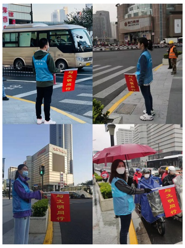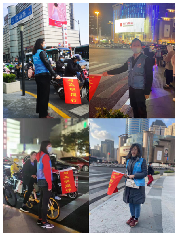 徐家汇地铁站附近商场林立,车流人流穿流不息,处于交通要道。党员们手持“与文明同行”小红旗执勤,积极引导市民文明行路、文明骑车,全身心助力督导进博会期间徐家汇街道的交通路况。遇到有人询问道路,他们便耐心地给予解答。