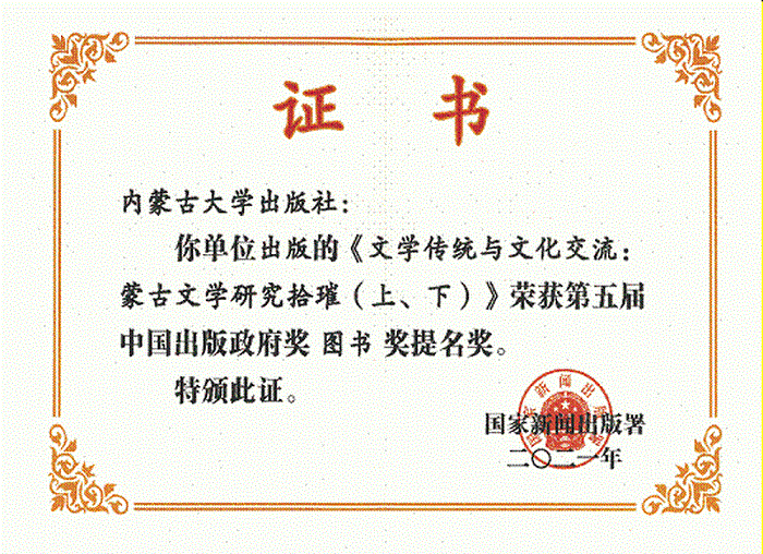 内蒙古大学出版社出版发行的《文学传统与文化交流:蒙古文学研究拾璀》在2021年第五届中国出版政府奖图书奖评选中获得提名奖。